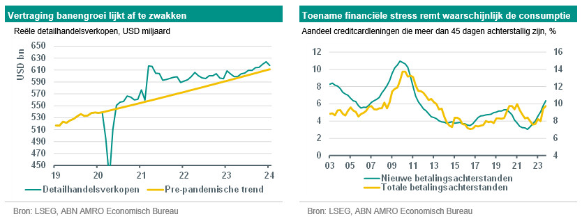 De update van onze groeiramingen is het gevolg van twee belangrijke factoren. De eerste factor is ‘achterwaarts’ gericht: hoewel de economie aanzienlijk vertraagt, hield de activiteit (met name de consumptie) in de laatste maanden van 2023 beter stand dan verwacht. Alleen dit 'overloopeffect' al verhoogt onze prognose voor 2024. De tweede drijvende factor achter de verandering is de kracht van de arbeidsmarkt. Hoewel we niet te veel signalen ontlenen aan de zeer sterke banencijfers over januari, die gebaseerd zijn op een relatief lage respons op de enquête, suggereren de aanzienlijke opwaartse herzieningen van de werkgelegenheid in het vierde kwartaal van 2023 dat de vertraging van de banengroei uitgevlakt is. Daarom verwachten we slechts een marginale stijging van de werkloosheid (van de huidige 3,7% naar ongeveer 4%). Hoewel hogere creditcardschulden en een verminderde spaarbuffer nog steeds wijzen op een zekere vertraging van de consumptie, is de vertraging minder groot dan we eerder voorspelden.