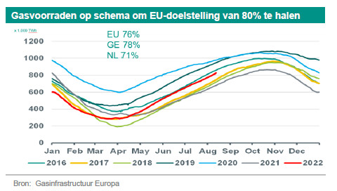 De Europese gasvoorraden liggen op schema om de EU-doelstelling om vóór november voor 80% gevuld te zijn te halen - maar tegen exorbitante kosten. De gasprijs is in de zomer verder gestegen, waarbij het 1-maands Nederlandse TTF-contract is opgelopen tot meer dan 300 euro/Mwh - ongeveer 10x zo hoog als eerdere historische pieken. De voorraden zijn grotendeels opgevuld met behulp van extra LNG-leveringen, die tot dusver het aanbodtekort uit Rusland hebben gecompenseerd. Nu de LNG-voorraden wereldwijd beperkt zijn, heeft dit geleid tot energietekorten in minder welvarende delen van de wereld die niet kunnen concurreren met de prijzen die de Europeanen bereid zijn te betalen. Wij verwachten dat deze hoge energieprijzen de inflatie in de komende maanden nog verder zal opdrijven. Bovendien zouden volgens het Internationaal Energieagentschap (IEA) Europese landen, zelfs met relatief volle voorraden, nog met zodanige gastekorten kunnen worden geconfronteerd dat enige rantsoenering tijdens de winter noodzakelijk wordt. Zelfs in een positief scenario zal Europa in de wintermaanden nog steeds sterk afhankelijk zijn van extra gasstromen (vooral LNG), waarvoor de wereldwijde concurrentie verder zou kunnen verscherpen - wat tot nog hogere prijzen zou kunnen leiden dan we nu al zien.
