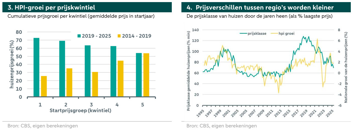 Om de prijsgroeidynamiek verder te onderzoeken, kijken we naar regionale prijsverschillen. Figuur 3 toont de gemiddelde regionale huizenprijsgroei voor verschillende regio's, gesorteerd op initiële prijskwintielen**. Voor de periode tussen 2019 en vandaag zien we dat regio's met een bij aanvang lager prijsniveau, zoals landelijke provincies, een sterkere totale prijsgroei hebben laten zien dan gebieden met initieel hogere prijzen, zoals Amsterdam. De prijzen in die "goedkopere" regio's halen hun achterstand dus in. Interessant is dat we voor de periode 2014-2019 een omgekeerd patroon zien, waarbij regio's met aanvankelijk hogere prijzen sterker groeiden. In figuur 4 geven we de prijsklasse van de verschillende regio's in de loop van de tijd weer als percentage van de minimumprijs***. Bijvoorbeeld, in het eerste kwartaal van 1995 waren de gemiddelde huizenprijzen in de duurste regio 60% hoger dan in de goedkoopste regio. We zien dat tijdens periodes van hausse op de woningmarkt, zoals in 1999 tot 2000 of 2015 tot 2020, de bandbreedte toeneemt. Dure regio's laten aan het begin van deze hausses een sterkere prijsstijging zien. Op een gegeven moment wordt de bandbreedte echter kleiner, omdat "goedkopere" regio's hun achterstand inhalen. Daar zijn verschillende oorzaken voor, maar meestal duidt dit op het einde van de hausse. We zien momenteel dat de prijsverschillen tussen regio's kleiner worden, een teken dat de totale huizenprijsgroei zou kunnen vertragen.