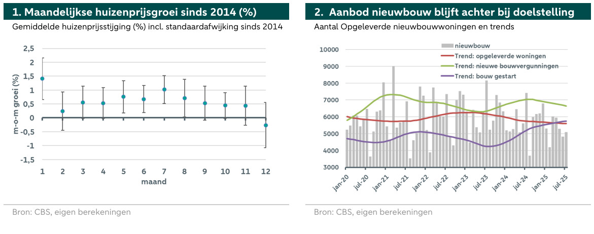 In het derde kwartaal van het jaar wordt duidelijk dat de Nederlandse huizenprijzen opnieuw aanzienlijk zullen stijgen. De prijzen liggen tot augustus 7,7% hoger dan vorig jaar. Ervan uitgaande dat de prijzen de rest van het jaar zullen blijven stijgen, verwachten we dat de jaarlijkse huizenprijsstijging in 2025 boven de 8% zal uitkomen. De onderliggende factoren wijzen erop dat dit scenario inderdaad zeer waarschijnlijk is (zie onderstaande paragrafen). Ook de technische analyse suggereert een dergelijk scenario en geeft enkele aanwijzingen over de omvang van stijging. Figuur 1 toont de gemiddelde maandelijkse huizenprijsstijging per maand van de afgelopen 10 jaar. We zien dat de huizenprijsstijging vanaf augustus meestal licht afneemt, maar tot november licht positief blijft. In december zien we historisch gezien een prijsdaling, gevolgd door een scherpe prijsstijging in januari. Gezien dit patroon in combinatie met de fundamentele factoren van de woningmarkt, verwachten we dat de prijzen zullen blijven stijgen en verhogen we onze prognose voor 2025 van 8% naar 8,7%. Voor 2026 verwachten we dat de vraag zal iets afnemen en het aanbod langzaam zal aantrekken. We laten onze prijsprognose voor 2026 daarom ongewijzigd op 3%.