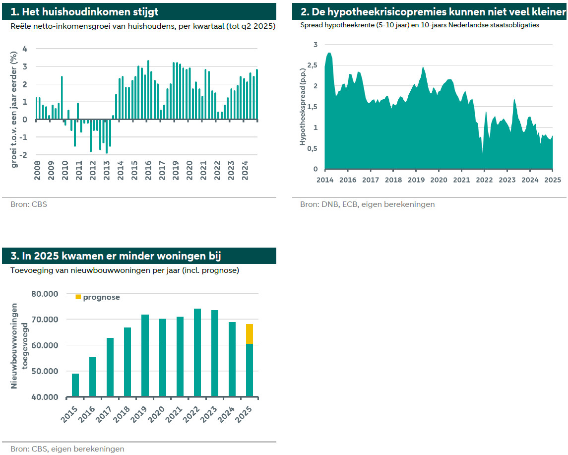Nadat de EU heeft erkend dat er een woningcrisis is in Europa, heeft zij onlangs haar plan voor betaalbare huisvesting . In het algemeen streeft de EU ernaar het woningaanbod te vergroten door beperkingen te verminderen, regels tussen lidstaten gelijk te trekken en meer financieringsmogelijkheden te bieden. Het plan is op veel punten nog niet echt concreet, maar het idee is om in 2026 en 2027 een nieuwe wet en een pakket concrete maatregelen te introduceren. Wat nu al kan worden gezegd, is dat de EU meer grensoverschrijdende bouwactiviteiten wil stimuleren, die momenteel beperkt zijn door nationale regelgeving. Verder wil de EU de bouwvoorschriften vereenvoudigen, waardoor processen efficiënter en mogelijk goedkoper worden. Bovendien geeft het plan nationale overheden meer vrijheid om betaalbare woningen te financieren door eerdere ondersteuningslimieten op te heffen. Voor Nederland betekent dit dat het middenhuur segment kan worden ondersteunt met meer subsidies, bijvoorbeeld door de activiteiten van woningcorporaties uit te breiden naar dit segment. Dit kan het voor projectontwikkelaars financieel aantrekkelijker maken, waardoor het aanbod toeneemt. Een ander aandachtspunt van het plan is het vaststellen van EU-brede regelgeving voor korte termijnverhuur, zoals Airbnb. Aangezien de meeste grote steden in Nederland echter al lokale regelgeving hebben, verwachten we dat dit voor Nederland minder gevolgen zal hebben. Over het geheel genomen zou het plan interessante impulsen kunnen geven voor het woningaanbod in de komende jaren. In dit vroege stadium denken we niet dat de voorgestelde maatregelen invloed zullen hebben op de prijzen in 2026 en 2027 en hebben we ze niet meegenomen in onze voorspelling.