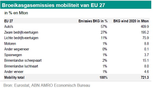 Volgens Eurostat was de mobiliteitssector verantwoordelijk voor 21% van de totale EU-uitstoot in 2020. Het wegvervoer is de grootste uitstoter in de mobiliteitssector. Het is verantwoordelijk voor ongeveer 95% van de totale emissies van de mobiliteitssector. Onderstaande tabel toont de broeikasgasemissies van de mobiliteitssector in de EU-27 in 2020 in megaton en als percentage van het totaal van de mobiliteit. Personenauto's nemen 57% van de emissies van de mobiliteitssector voor hun rekening; voor . bedrijfsvoertuigen is dat ongeveer 38%. Dit is de som van de emissies en de percentages van lichte en zware bedrijfsvoertuigen zoals vrachtwagens, bestelwagens en bussen. In 2021 waren er in totaal bijna 250 miljoen auto's op de weg. In de hele Europese Unie reden 29,5 miljoen bestelwagens (tot 3,5 ton) rond en 6,4 miljoen middelzware en zware bedrijfsvoertuigen en 714.000 bussen.
