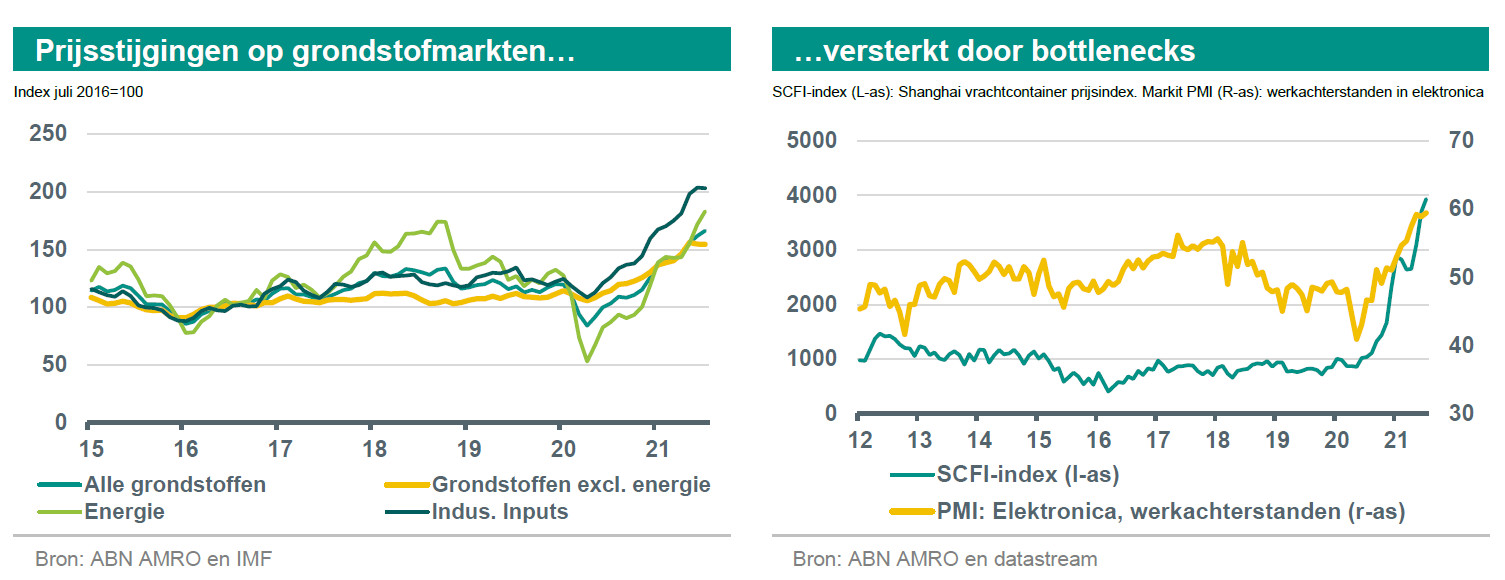 De aanbodzijde van de economie - aan het begin van de pandemie flink opgeschud door de corona restricties en afgeschaald door de verslechterde vooruitzichten - heeft in 2021 moeite om deze snel terugkerende vraag te bedienen. Illustratief hiervoor zijn de prijsstijgingen op grondstoffenmarkten die vervolgens doorwerken in de prijzen van producten. De olieprijs daalde in 2020 tot ver onder het historische gemiddelde en is de afgelopen maanden gestegen. Ook industriële grondstoffen (bijvoorbeeld metalen en agri producten) zijn volgend op het herstel van de mondiale economie, maar vooral van die in China, in prijs gestegen.