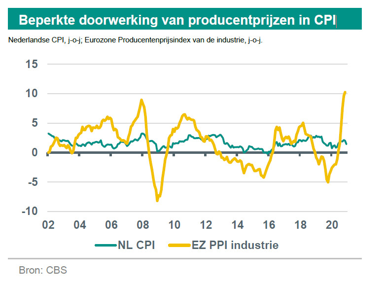 Door de mondiale mismatch tussen vraag en aanbod liepen vooral de producentenprijzen de afgelopen maanden sterk op. In de eurozone stegen de producentenprijzen in juni meer dan 10 procent j-o-j en in de VS bedroeg de stijging in juli bijna 8 procent. Maar ook de consumentenprijzen stegen. In de VS kwam in juli de consumentenprijsstijging uit op 5,4 procent j-o-j. Ook in Nederland werken de stijgende internationale prijzen door in de inflatie, hetzij minder heftig dan in de VS (NL: 1.4 procent j-o-j in juli). Sinds de heropening is de gemiddelde stijging van de consumentenprijsindex (CPI) opgelopen tot rond de 2 procent. Dat is alsnog hoger dan het langjarig gemiddelde van 1,6 procent.