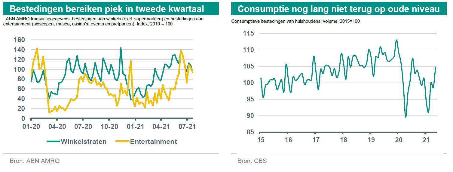 In april en mei – nadat de economie weer heropende - groeide de consumptieve bestedingen met gemiddeld 9,4 procent jaar-op-jaar. Dat is niet vreemd, in april en mei vorig jaar daalde consumptie sterk door de coronamaatregelen. ABN AMRO transactiedata laten zien dat de groei van de vraag in de heropende sectoren in de afgelopen weken weer wat stagneert (zie grafiek linksonder). Nadat de economie weer open ging, gingen zij die dit konden betalen naar de winkelstraat en een dagje uit, maar vervolgens vervielen we weer in ons oude patroon.