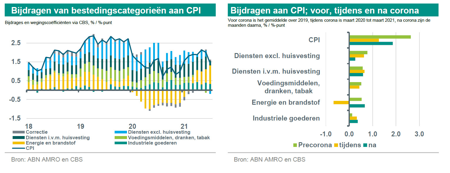 Door de mondiale mismatch tussen vraag en aanbod van grondstoffen en eindproducten liepen de inflatiecijfers de afgelopen maanden op. Sinds de heropening is de gemiddelde stijging van de consumentenprijsindex (CPI) in Nederland opgelopen tot rond de 2 procent jaar-op-jaar, dat is 0,4 procentpunt hoger dan het langjarig gemiddelde.