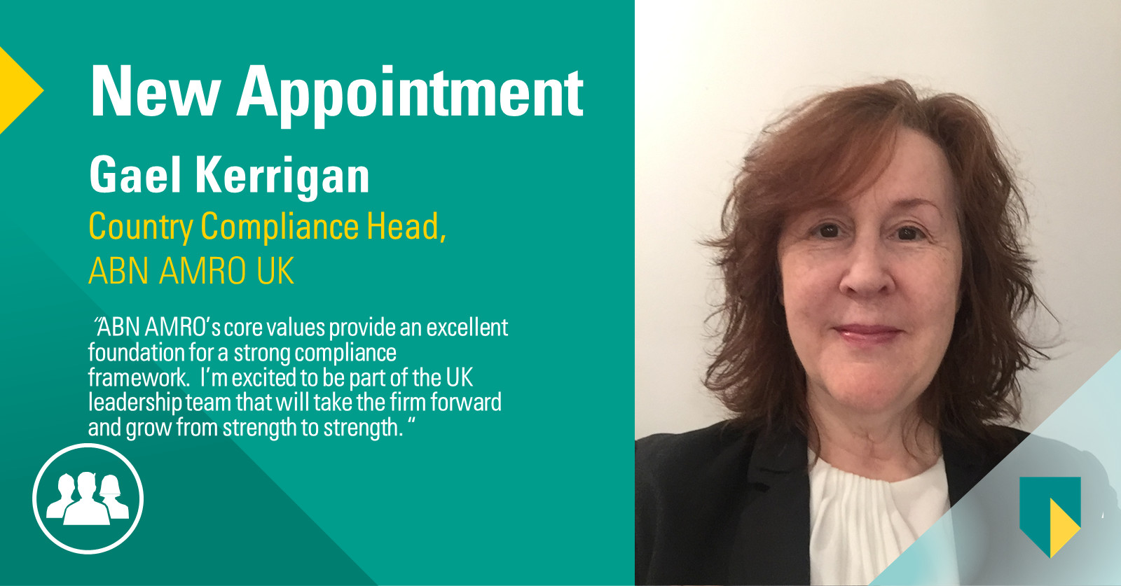 “Gerben Dragt, UK Country Executive, said, “I am delighted that Gael has chosen to join ABN AMRO UK as our new Head of Compliance. Please join me in welcoming her to the team!"”
